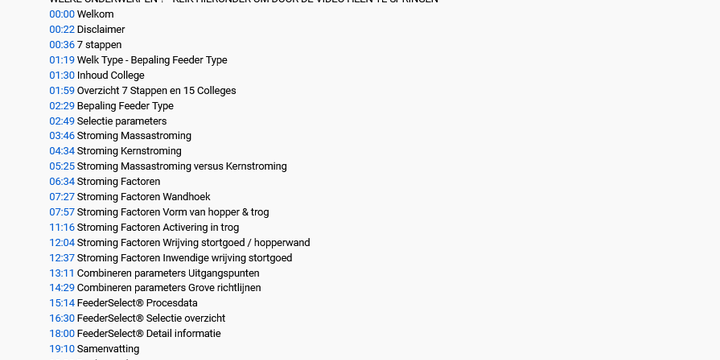 In ieder college zijn hoofdstukken toegevoegd waardoor je snel naar de gewenste informatie toe kan springen. Die vind je in de playbar of wanneer je doorklikt naar YouTube, in de beschrijving (zie hiervoor ook de afbeeldingen).