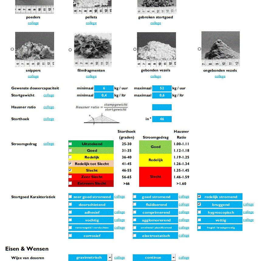 Het door SPS | Solids Process Solutions ontwikkelde programma, selecteert geschikte feedertype(s) op basis van in te geven procesgegevens van de doseertoepassing. Dit is geheel zelfstandig in te voeren op ieder gewenst moment.